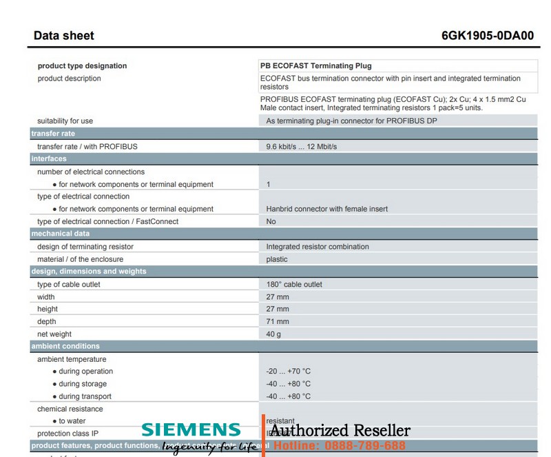 Đại lý chính hãng SIEMENS Đầu Cắm Terminator 6GK1905-0DA00 PROFIBUS ECOFAST Đồng – Bộ 5 Cái, Trở Kháng 220Ω PROFIBUS ECOFAST terminating plug (ECOFAST Cu); 2x Cu; 4 x 1.5 mm2 Cu Male contact insert, Integrated terminating resistors 1 pack=5 units.
